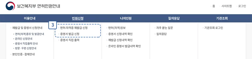 ② 또는 TOP 메뉴 [민원신청 → 면허(자격)증 재발급 신청] 메뉴로 이동합니다.