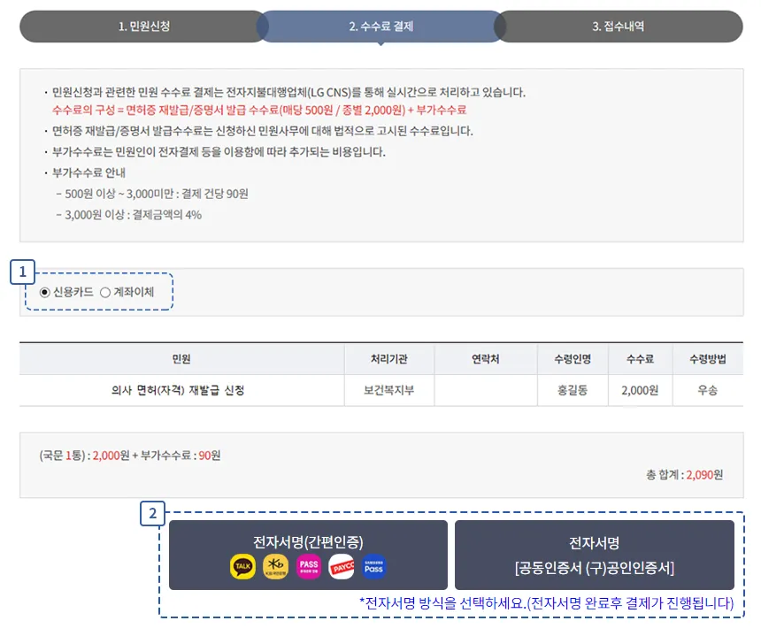 재발급 수수료는 신청 방식에 따라 다르며 보통 소액의 발급 수수료가 발생합니다. 온라인 결제 후 접수가 완료됩니다.