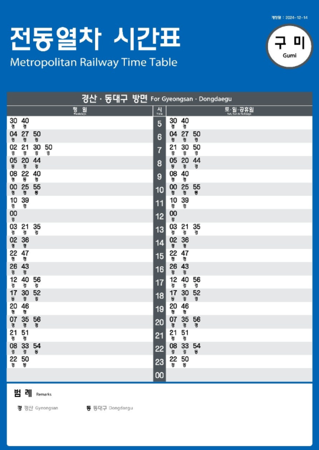 - Q5. 구미역 대경선 시간표는 평일과 주말이 다른가요?