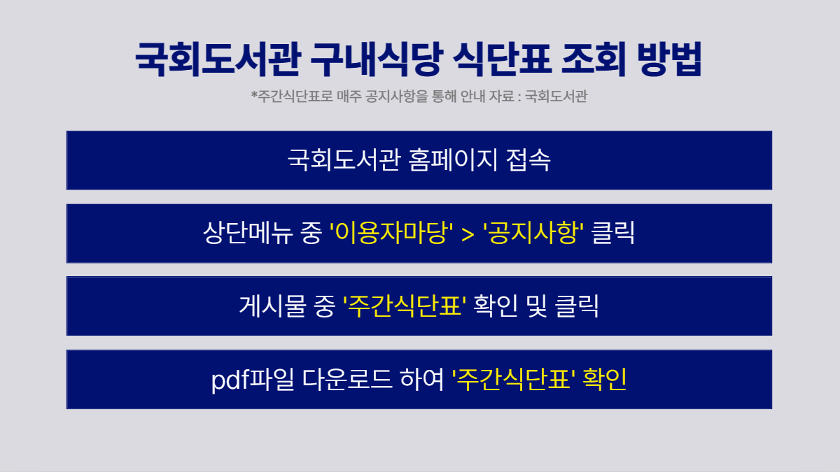 공식 식단 정보는 국회도서관 홈페이지 공지사항에서 주간식단표 문서로 열람 가능합니다.