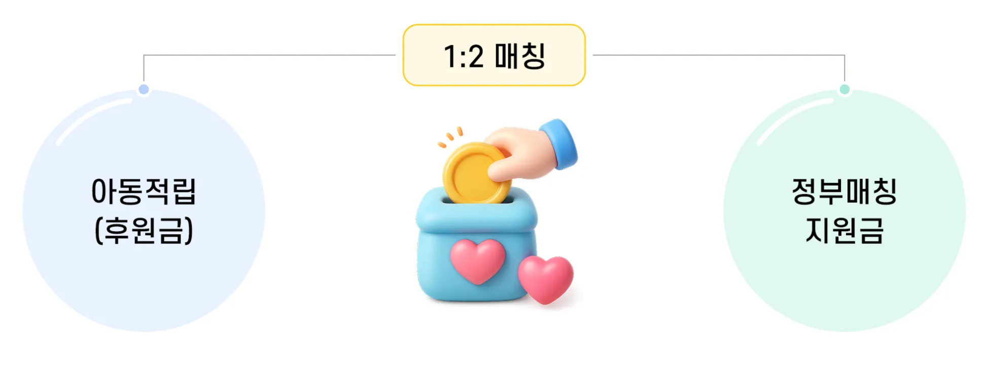 아동(또는 보호자, 후원자)이 매월 일정 금액을 적립하면, 정부(지자체)가 월 최대 10만 원 한도 내에서 1:2 매칭 적립금을 지원합니다. 적립된 금액은 아동이 학자금, 취업훈련비, 주거마련, 창업지원 등 자립 준비 비용으로 쓸 수 있도록 설계되어 있습니다.