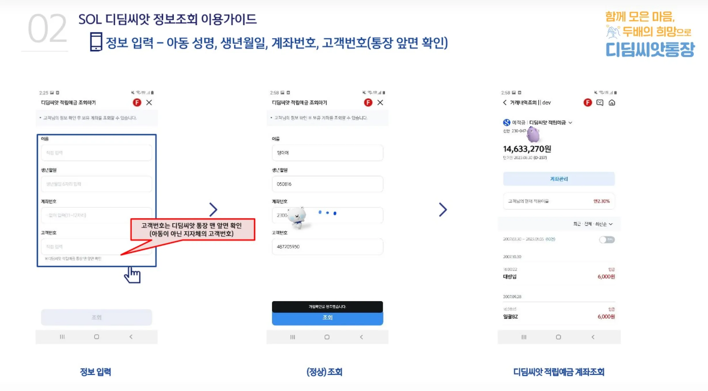 모든 정보를 입력 후 조회 버튼을 누르면 해당 아동의 디딤씨앗통장 정보가 바로 조회됩니다.