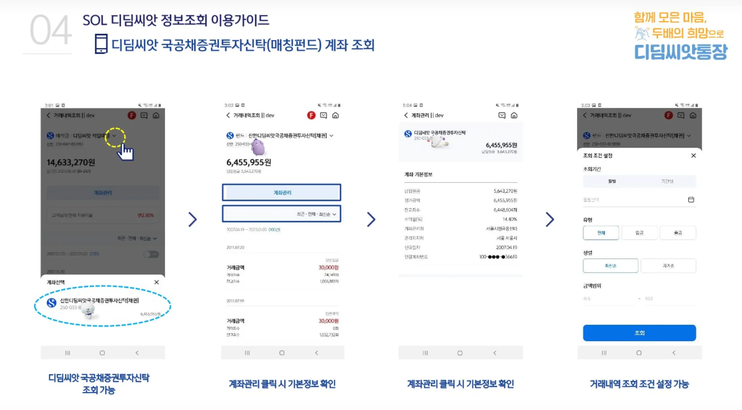 디딤씨앗통장(적립예금·국공채증권투자신탁)은 신한 SOL 앱에서 조회 가능하며, 아동 정보와 계좌 정보만 입력하면 비로그인 상태에서도 조회가 가능한 서비스입니다.