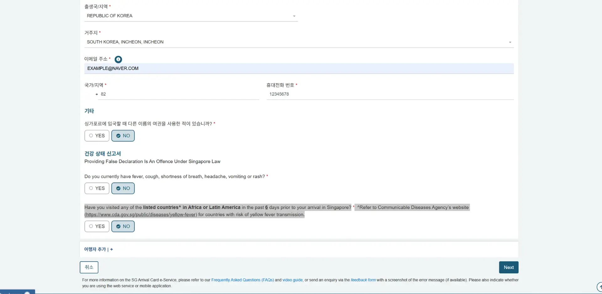 싱가포르 전자입국신고서 관련 FAQ