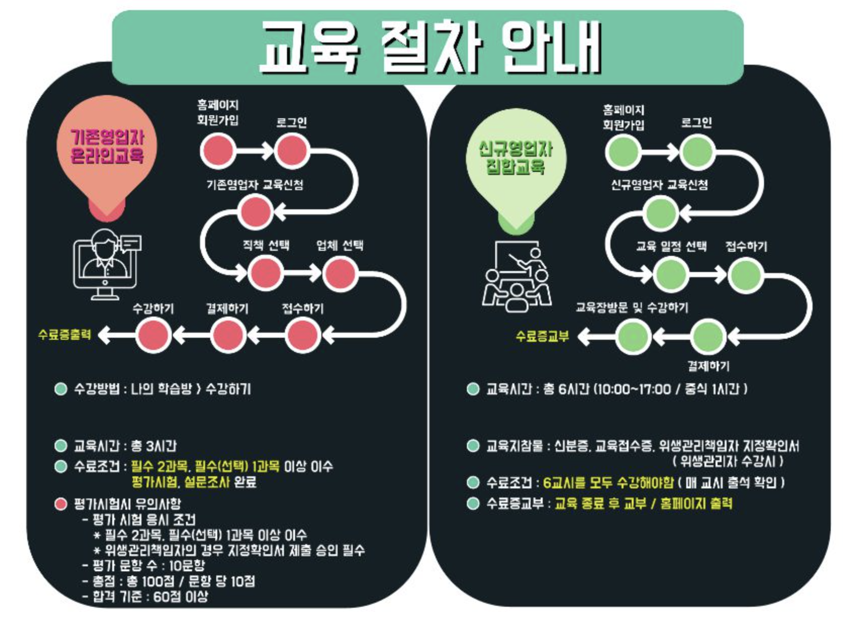 신규 영업자 / 명의 변경자 / 지위 승계자새로운 음식점(일반음식점, 휴게음식점, 제과점 등) 운영 전 위생교육 이수 필수