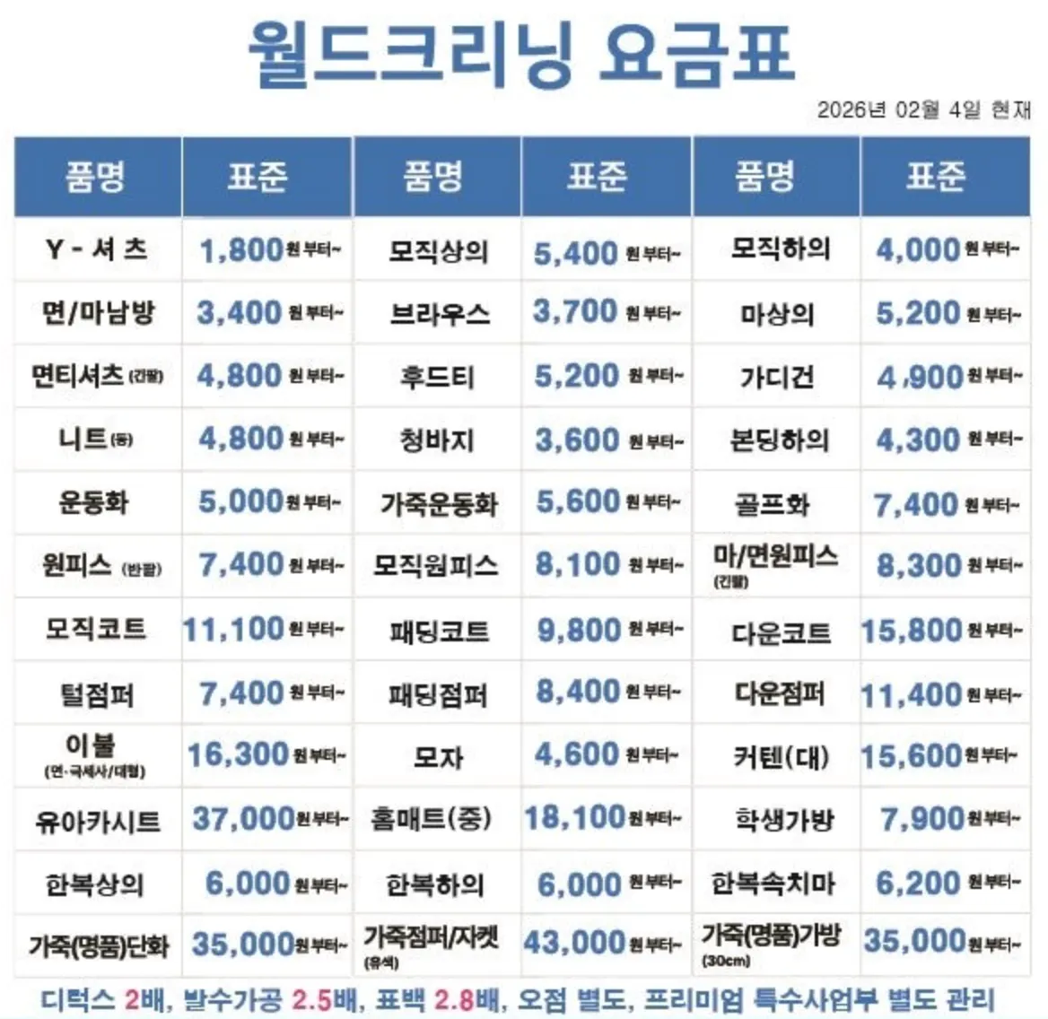 1. 한눈에 보는 최신 월드크리닝 가격표 (표준 단가)