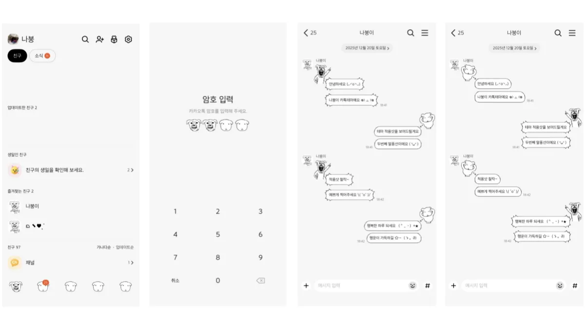 - 미친 귀여움의 디테일: 하단 메뉴바, 잠금화면의 비밀번호 창, 대화창 말풍선마다 각기 다른 표정으로 화를 내고 있는 털찐 강아지(가나디) 얼굴이 박혀있어 헛웃음이 납니다.