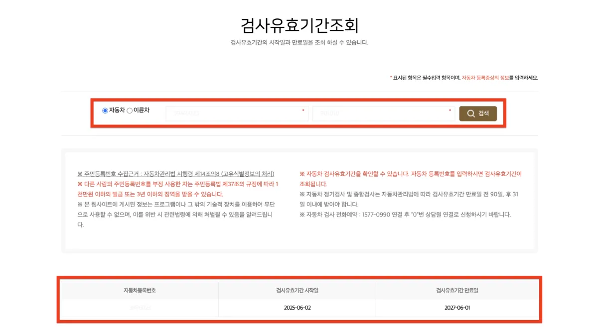 ⚠️ 검사 유효기간은 **차량 등록정보와 검사이력**을 기준으로 조회됩니다. ⚠️ 검사 연장·위반 시 과태료가 부과될 수 있으므로 빠르게 확인하세요.