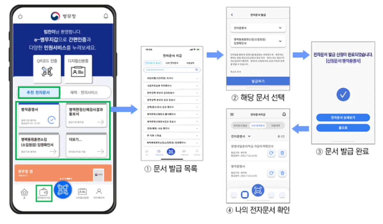 📱 앱 설치 → 본인 인증 → 문서 선택 → 전역증/병적증명서 발급