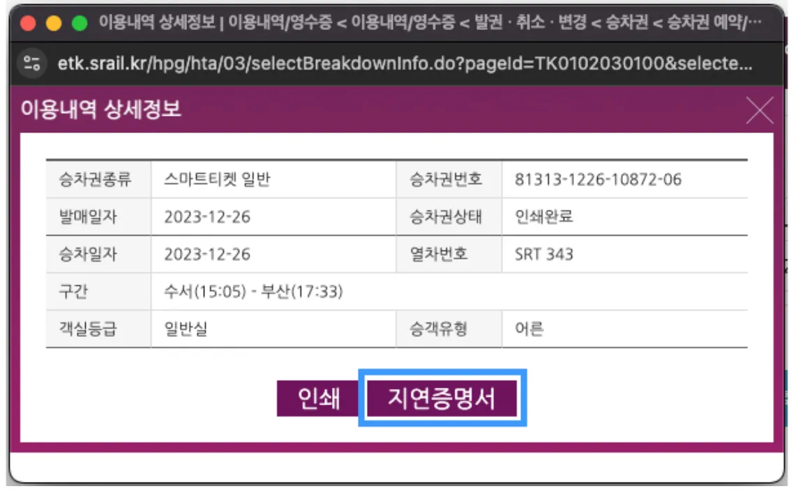 아래 버튼을 통해 연착증명서를 확인하고 바로 출력할 수 있습니다.