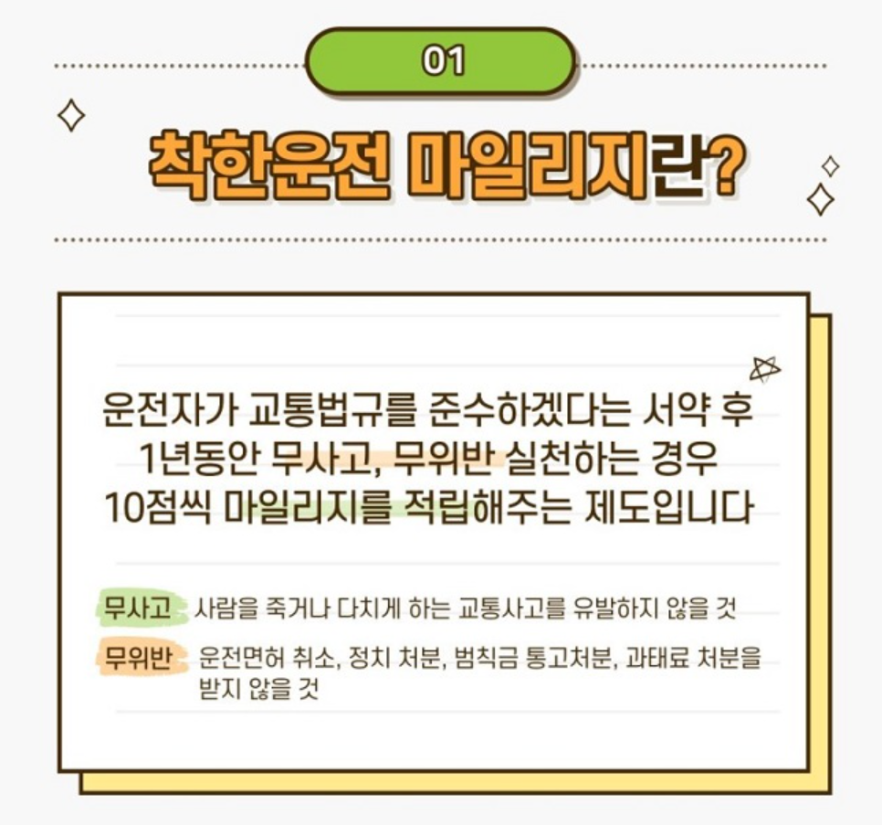 이 제도는 경찰청이 운영하는 정책으로, 교통법규 준수 서약을 한 운전자가 일정 기간 무위반·무사고를 달성하면 마일리지 점수(10점)를 적립해 두었다가, 추후 벌점이 부과될 경우 감경 혜택을 받을 수 있습니다.