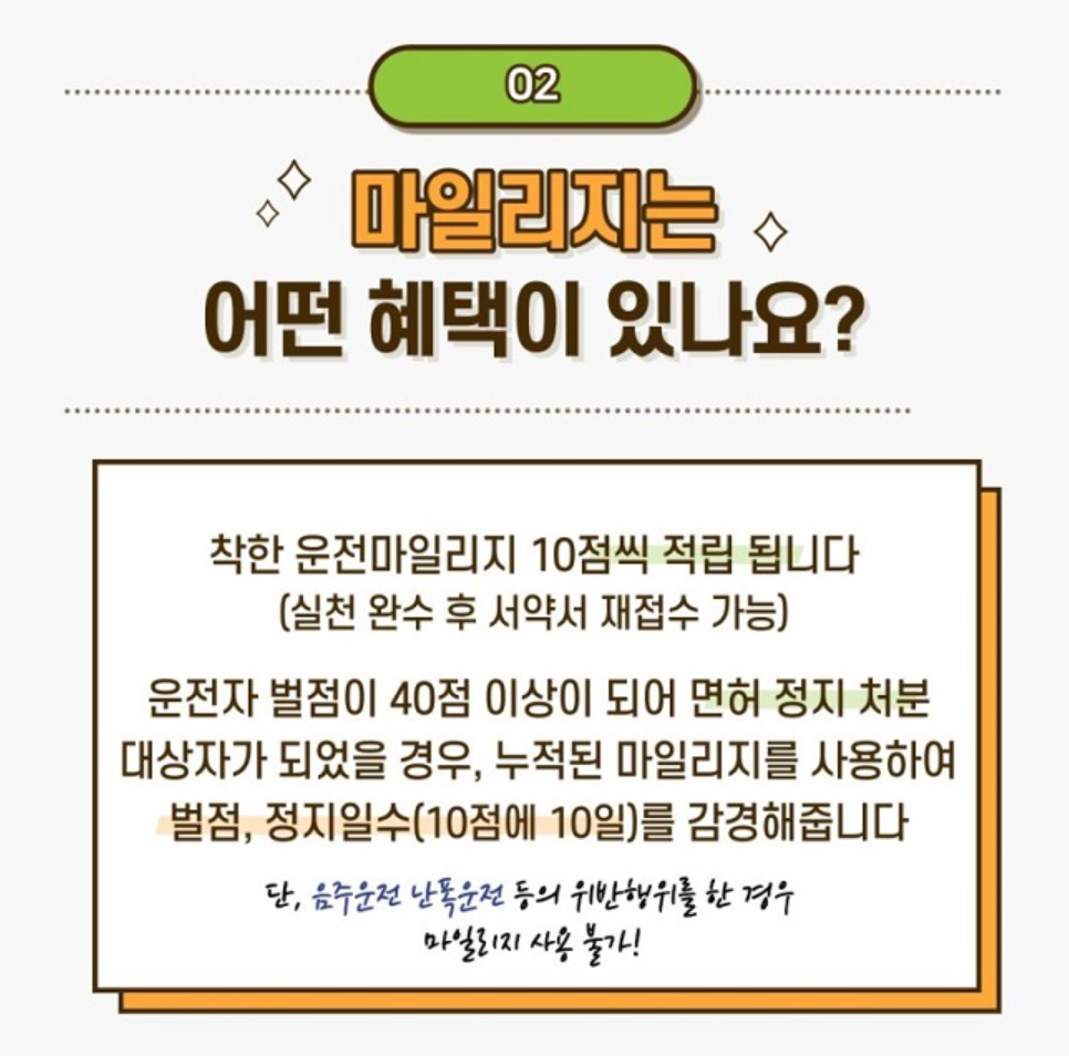 사용 조건 | 운전면허 벌점이 40점 이상이 되어 정지 처분 대상 시, 적립된 마일리지를 벌점 감경 또는 정지 일수 감경에 사용 가능 |