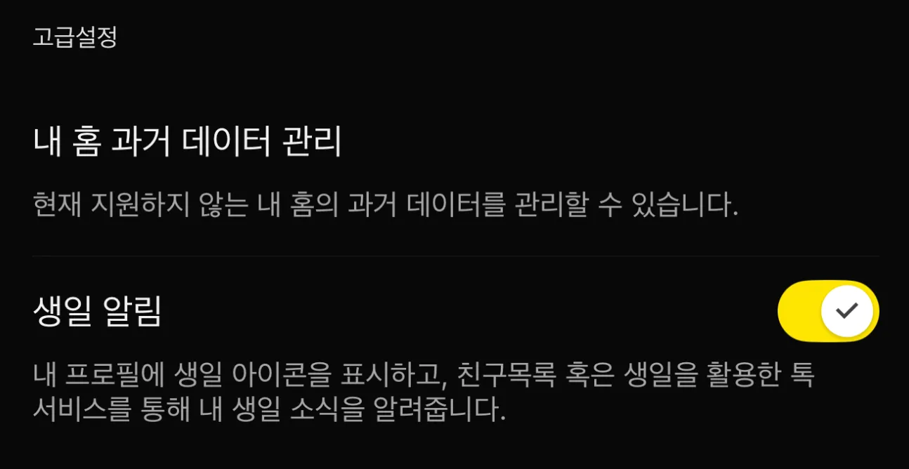 카카오톡은 업데이트에 따라 메뉴 위치나 설정 이름이 변경될 수 있습니다. 이 경우 설정 메뉴의 친구, 알림, 또는 개인정보 관련 항목에서 생일 설정을 찾을 수 있습니다.