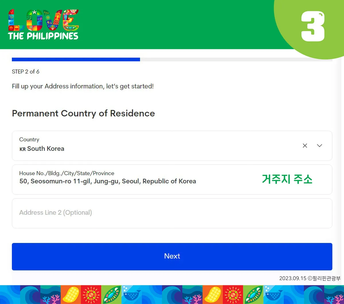 - Travel Details : 입국 목적, 필리핀 내 체류 주소 입력