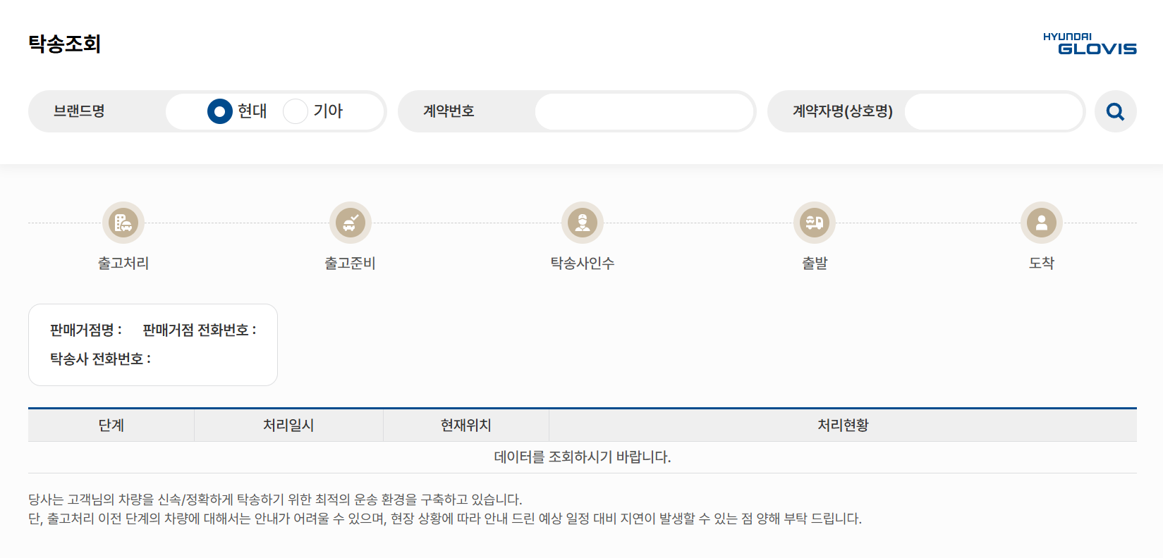 - 조회 채널 : 현대글로비스 신차배송조회(고객용)