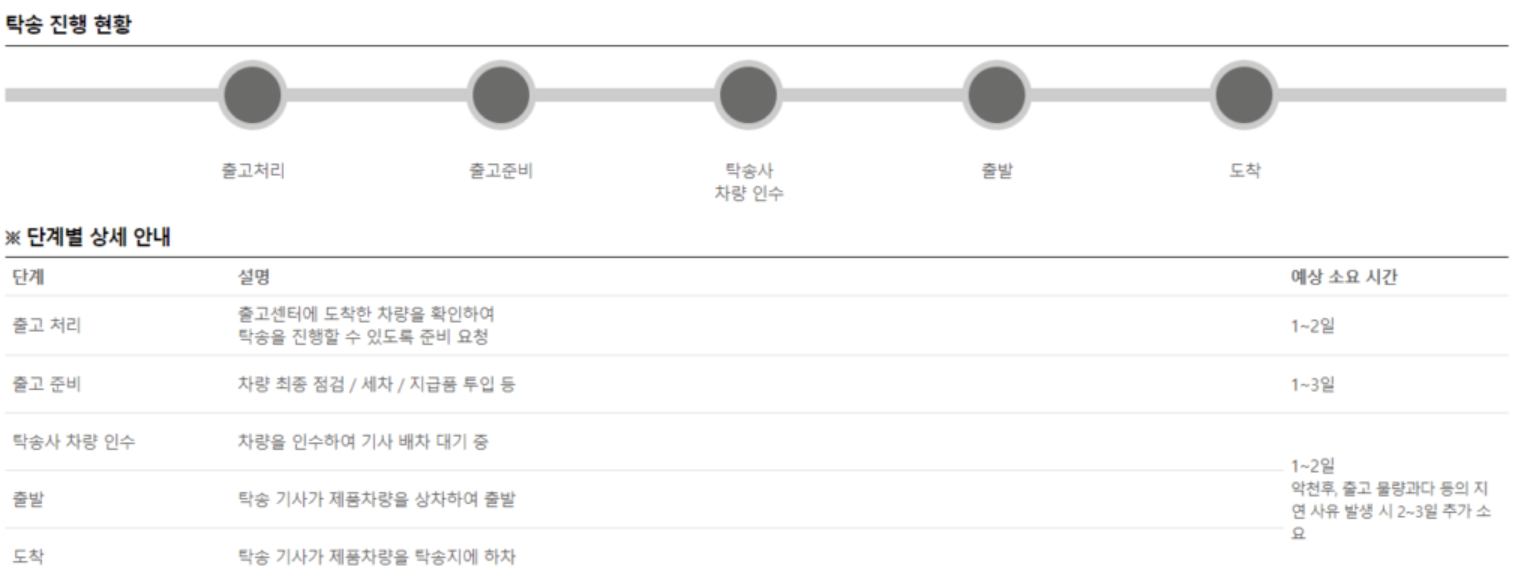 - 출고준비: 탁송 전 점검·서류 처리 단계