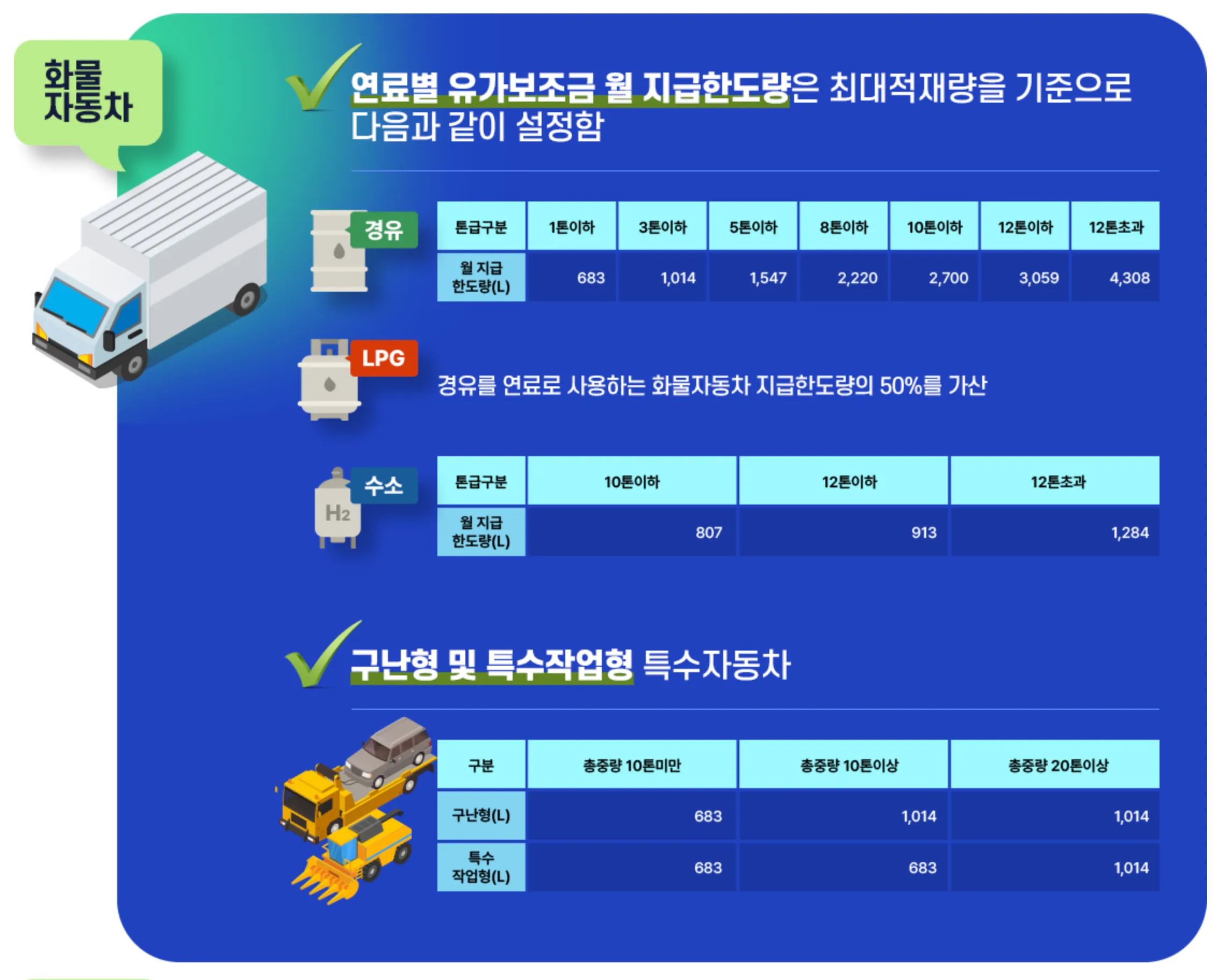 유가보조금은 주유소에서 기름을 넣는 족족 무제한으로 지원해 주지 않습니다. 차량의 적재중량(톤수)이 클수록 한 달에 지원받을 수 있는 최대 리터(ℓ)의 한도량이 철저하게 관할 구청과 유가보조금 한도관리 시스템법으로 묶여있습니다. 아래 표는 최신 화물차 유가보조금액 월별 한도량 기준입니다.