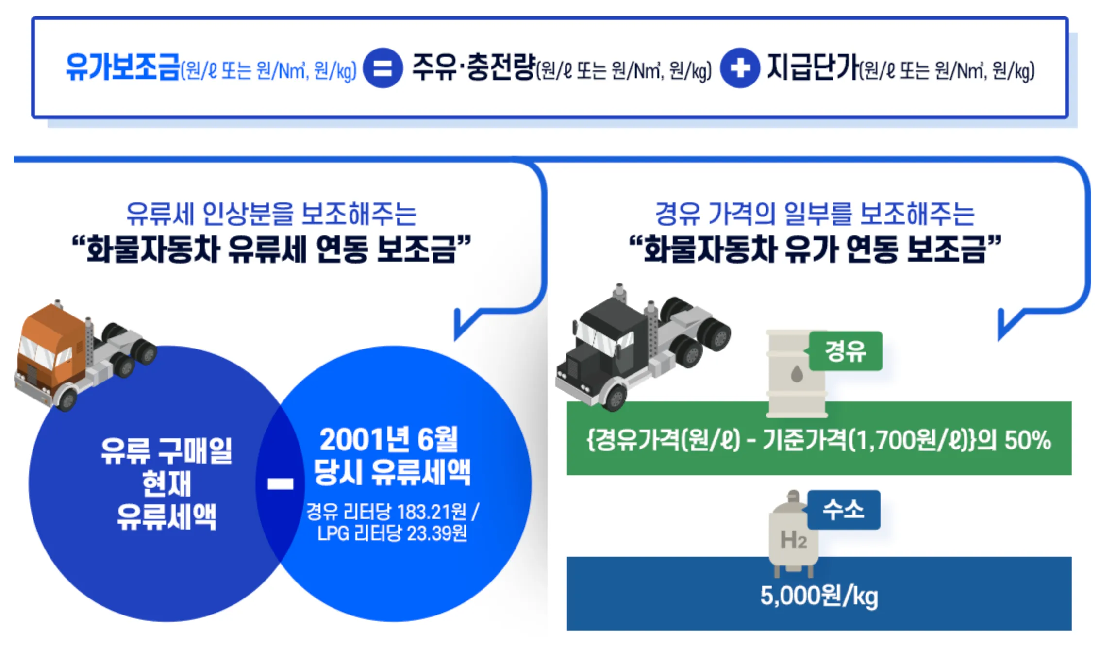 실제로 정산되는 화물차 유가보조금액 산정 방식은 오피넷(한국석유공사) 등에 발표되는 변동 유가 인상분에 따라 단가가 결정됩니다. 지정된 유류세(경유 기준 교통·에너지·환경세 등)의 차액을 바탕으로 리터당 평균 345원 수준의 단가를 할인받게 됩니다. (이는 유가 연동형으로 매년/매월 수시 변동됩니다.)