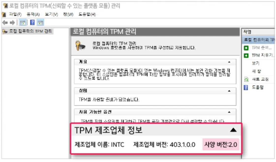 윈도우10 서비스 종료로 인해, 추후 보안에 대한 안정성을 우려하여 윈도우11(Windows 11)로 업그레이드하거나 보안 기능을 강화하려면 TPM 2.0이 활성화되어 있어야 합니다.